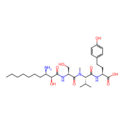 | InChI | InChI=1S/C29H48N4O8/c1-5-6-7-8-9-10-21(30)25(36)27(38)32-23(17-34)28(39)33(4)24(18(2)3)26(37)31-22(29(40)41)16-13-19-11-14-20(35)15-12-19/h11-12,14-15,18,21-25,34-36H,5-10,13,16-17,30H2,1-4H3,(H,31,37)(H,32,38)(H,40,41)/t21-,22+,23+,24+,25+/m1/s1 |