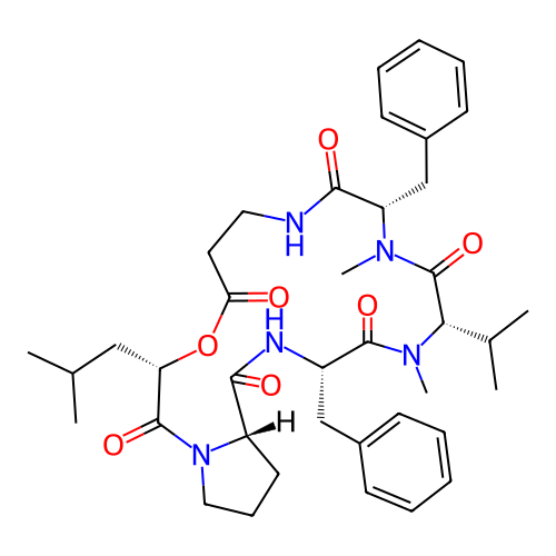 | InChI | InChI=1S/C39H53N5O7/c1-25(2)22-32-38(49)44-21-13-18-30(44)36(47)41-29(23-27-14-9-7-10-15-27)37(48)43(6)34(26(3)4)39(50)42(5)31(24-28-16-11-8-12-17-28)35(46)40-20-19-33(45)51-32/h7-12,14-17,25-26,29-32,34H,13,18-24H2,1-6H3,(H,40,46)(H,41,47)/t29-,30-,31-,32-,34-/m0/s1 |