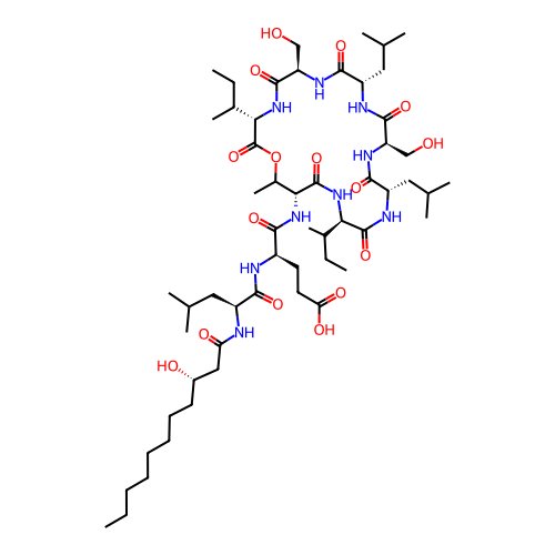 | SMILES | CCCCCCCC[C@@H](CC(=O)N[C@@H](CC(C)C)C(=O)N[C@H](CCC(=O)O)C(=O)N[C@@H]1C(OC(=O)[C@@H](NC(=O)[C@H](NC(=O)[C@@H](NC(=O)[C@H](NC(=O)[C@@H](NC(=O)[C@H](NC1=O)C(C)CC)CC(C)C)CO)CC(C)C)CO)C(C)CC)C)O |