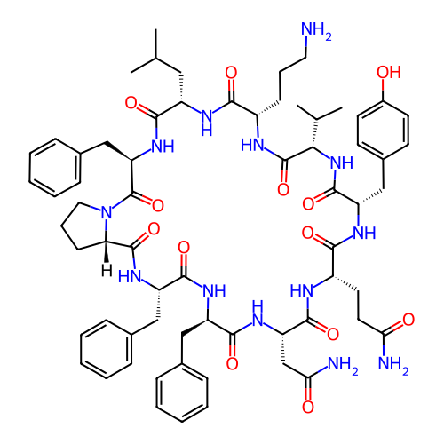 | SMILES | CC(C)C[C@H]1C(=O)N[C@@H](C(=O)N2CCC[C@H]2C(=O)N[C@H](C(=O)N[C@@H](C(=O)N[C@H](C(=O)N[C@H](C(=O)N[C@H](C(=O)N[C@H](C(=O)N[C@H](C(=O)N1)CCCN)C(C)C)CC3=CC=C(C=C3)O)CCC(=O)N)CC(=O)N)CC4=CC=CC=C4)CC5=CC=CC=C5)CC6=CC=CC=C6 |