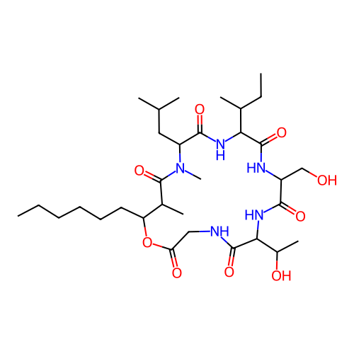| SMILES | CCCCCCC1C(C(=O)N(C(C(=O)NC(C(=O)NC(C(=O)NC(C(=O)NCC(=O)O1)C(C)O)CO)C(C)CC)CC(C)C)C)C |