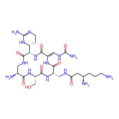 | SMILES | C1CN=C(N[C@H]1[C@H]2C(=O)NC[C@@H](C(=O)N[C@H](C(=O)N[C@H](C(=O)N/C(=C\NC(=O)N)/C(=O)N2)CNC(=O)C[C@@H](CCCN)N)CO)N)N |