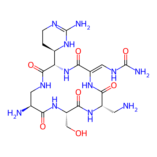 | SMILES | C1CN=C(N[C@H]1[C@H]2C(=O)NC[C@@H](C(=O)N[C@H](C(=O)N[C@H](C(=O)N/C(=C\NC(=O)N)/C(=O)N2)CN)CO)N)N |