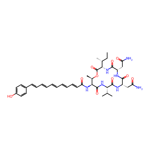 | SMILES | CC[C@@H](C)[C@H]1C(=O)O[C@@H]([C@@H](C(=O)N[C@H](C(=O)N[C@H](C(=O)N[C@H](C(=O)N1)CC(=O)N)CC(=O)N)C(C)C)NC(=O)/C=C/C=C/C=C/C=C/C=C/C2=CC=C(C=C2)O)C |