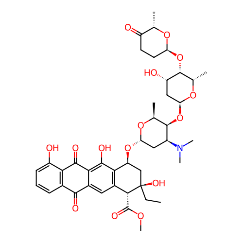 | InChI | InChI=1S/C42H53NO15/c1-8-42(51)17-28(33-22(35(42)41(50)52-7)14-23-34(38(33)49)37(48)32-21(36(23)47)10-9-11-26(32)45)56-30-15-24(43(5)6)39(19(3)54-30)58-31-16-27(46)40(20(4)55-31)57-29-13-12-25(44)18(2)53-29/h9-11,14,18-20,24,27-31,35,39-40,45-46,49,51H,8,12-13,15-17H2,1-7H3/t18-,19-,20-,24-,27-,28-,29-,30-,31-,35-,39+,40+,42+/m0/s1 |