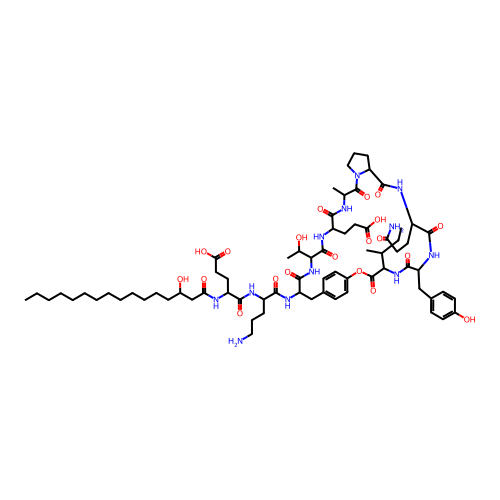 | SMILES | CCCCCCCCCCCCCC(CC(=O)NC(CCC(=O)O)C(=O)NC(CCCN)C(=O)NC1CC2=CC=C(C=C2)OC(=O)C(NC(=O)C(NC(=O)C(NC(=O)C3CCCN3C(=O)C(NC(=O)C(NC(=O)C(NC1=O)C(C)O)CCC(=O)O)C)CCC(=O)N)CC4=CC=C(C=C4)O)C(C)CC)O |
