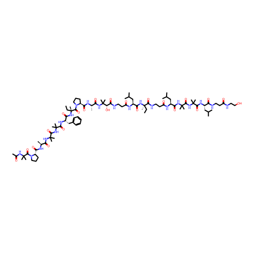 | SMILES | CC[C@@](C)(NC(=O)[C@H](CC(C)C)NC(=O)CCNC(=O)[C@H](O)C(C)(C)NC(=O)[C@H](C)NC(=O)[C@@H]1CCCN1C(=O)[C@@](C)(CC)NC(=O)[C@H](CC1=CC=CC=C1)NC(=O)C(C)(C)NC(=O)C(C)(C)NC(=O)[C@H](C)NC(=O)[C@@H]1CCCN1C(=O)C(C)(C)NC(C)=O)C(=O)NCCC(=O)N[C@@H](CC(C)C)C(=O)NC(C)(C)C(=O)NC(C)(C)C(=O)N[C@@H](CC(C)C)C(=O)NCCC(=O)NCCO |