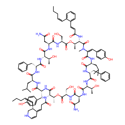 | SMILES | CCC/C=C\[C@@H]\1CNC=C/C1=C/CC(=O)N[C@H]2[C@H](OC(=O)[C@@H](NC(=O)[C@@H](NC(=O)[C@@H](NC(=O)[C@H](NC(=O)[C@@H](NC(=O)/C(=C\C3=CC=C(C=C3)O)/N(C(=O)[C@H]([C@H](OC(=O)[C@@H](NC(=O)[C@@H](NC(=O)[C@@H](NC(=O)[C@H](NC(=O)[C@@H](NC(=O)[C@H](NC2=O)CC4=CC=C(C=C4)O)CC(C)C)CC5=CC=CC=C5)[C@H](C)O)CC(=O)N)CO)C)NC(=O)/C=C/C6=CC=CC=C6/C=C\CCC)C)CC(C)C)CC7=CC=CC=C7)[C@H](C)O)CC(=O)N)CO)C |
