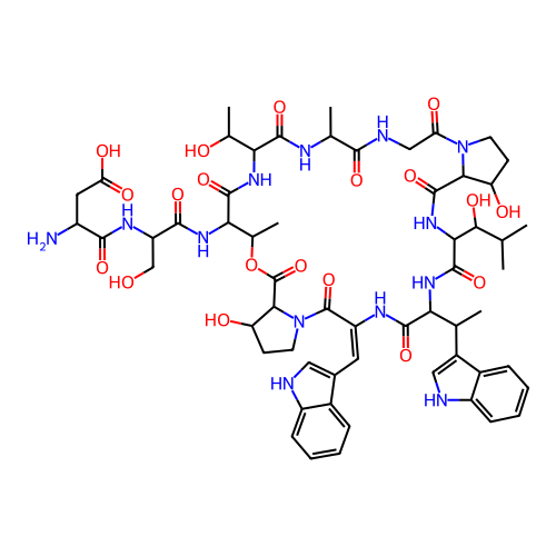 | SMILES | CC1C(C(=O)NC(C(=O)NC(C(=O)NCC(=O)N2CCC(C2C(=O)NC(C(=O)NC(C(=O)N/C(=C/C3=CNC4=CC=CC=C43)/C(=O)N5CCC(C5C(=O)O1)O)C(C)C6=CNC7=CC=CC=C76)C(C(C)C)O)O)C)C(C)O)NC(=O)C(CO)NC(=O)C(CC(=O)O)N |