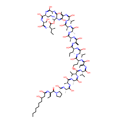 | SMILES | CCCCCCCC(CC(=N/C(=C\C)/C(=O)N1CCC[C@H]1C(=N[C@@H](C)C(=N[C@@H](C)C(=N[C@@H](C)C(=N[C@@H](C(C)C)C(=N[C@@H](C(C)C)C(=N/C(=C\C)/C(=N[C@@H](CCO)C(=N[C@@H](C(C)C)C(=N[C@@H]([C@H](C)CC)C(=NC(=C)C(=N[C@@H](C)C(=N[C@@H](C)C(=N[C@@H](C)C(=N[C@@H](C(C)C)C(=N/C(=C\C)/C(=N[C@H]2[C@@H](OC(=O)[C@@H](N=C([C@@H](N=C([C@@H](N=C([C@@H](N=C2O)C)O)CCN)O)CO)O)[C@@H](C)CC)C)O)O)O)O)O)O)O)O)O)O)O)O)O)O)O)O)O)O |