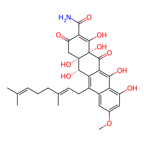 | InChI | InChI=1S/C30H33NO10/c1-13(2)6-5-7-14(3)8-9-16-17-10-15(41-4)11-18(32)20(17)24(34)23-21(16)25(35)29(39)12-19(33)22(28(31)38)26(36)30(29,40)27(23)37/h6,8,10-11,25,32,34-36,39-40H,5,7,9,12H2,1-4H3,(H2,31,38)/b14-8+/t25-,29-,30+/m0/s1 |