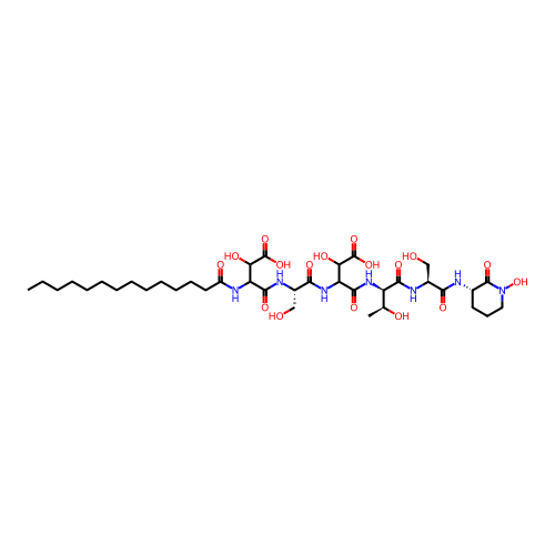 | SMILES | CCCCCCCCCCCCCC(=O)NC(C(C(=O)O)O)C(=O)N[C@@H](CO)C(=O)NC(C(C(=O)O)O)C(=O)N[C@H]([C@H](C)O)C(=O)N[C@@H](CO)C(=O)N[C@H]1CCCN(C1=O)O |