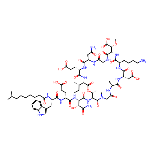 | SMILES | CC(C)CCCCCCC(N[C@H](C(N[C@@H](C(N[C@H](C(N[C@H]1[C@@H](C)OC([C@H]([C@H](CC)C)NC([C@H](CCC(O)=O)NC([C@@H](CC(N)=O)NC(CNC([C@H]([C@@H](OC)C(O)=O)NC([C@@H](CCCCN)NC([C@H](CC(O)=O)NC([C@H](C)NC(CN(C)C1=O)=O)=O)=O)=O)=O)=O)=O)=O)=O)=O)[C@@H](O)C(N)=O)=O)CCC(O)=O)=O)CC2=CNC3=CC=CC=C32)=O |