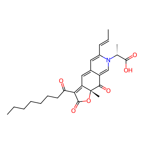 | InChI | InChI=1S/C26H31NO6/c1-5-7-8-9-10-12-21(28)22-20-14-17-13-18(11-6-2)27(16(3)24(30)31)15-19(17)23(29)26(20,4)33-25(22)32/h6,11,13-16H,5,7-10,12H2,1-4H3,(H,30,31)/b11-6+/t16-,26-/m1/s1 |