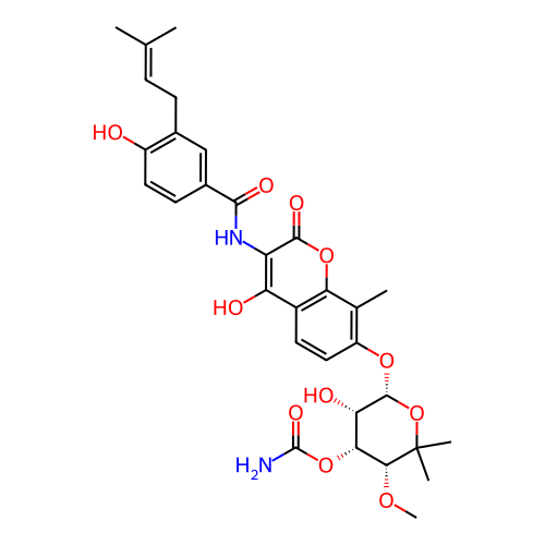 | SMILES | CC1=C(C=CC2=C1OC(=O)C(=C2O)NC(=O)C3=CC(=C(C=C3)O)CC=C(C)C)O[C@H]4[C@H]([C@H]([C@H](C(O4)(C)C)OC)OC(=O)N)O |