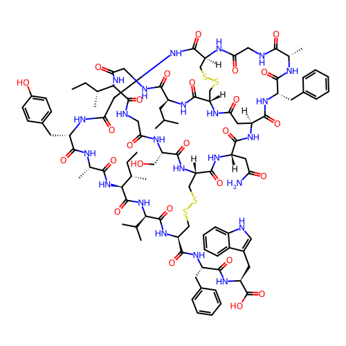 | SMILES | CC[C@@H](C)[C@H]1C(=O)NCC(=O)N[C@H](C(=O)N[C@H]2CSSC[C@H](NC(=O)[C@H](NC(=O)[C@@H](NC(=O)[C@@H](NC(=O)[C@@H](NC(=O)CNC(=O)[C@@H]3CSSC[C@@H](C(=O)N[C@H](C(=O)NCC(=O)N1)CC(C)C)NC(=O)C[C@@H](C(=O)N[C@H](C(=O)N[C@H](C(=O)NCC(=O)N3)C)CC4=CC=CC=C4)NC(=O)[C@@H](NC2=O)CC(=O)N)CC5=CC=C(C=C5)O)C)[C@@H](C)CC)C(C)C)C(=O)N[C@@H](CC6=CC=CC=C6)C(=O)N[C@@H](CC7=CNC8=CC=CC=C87)C(=O)O)CO |