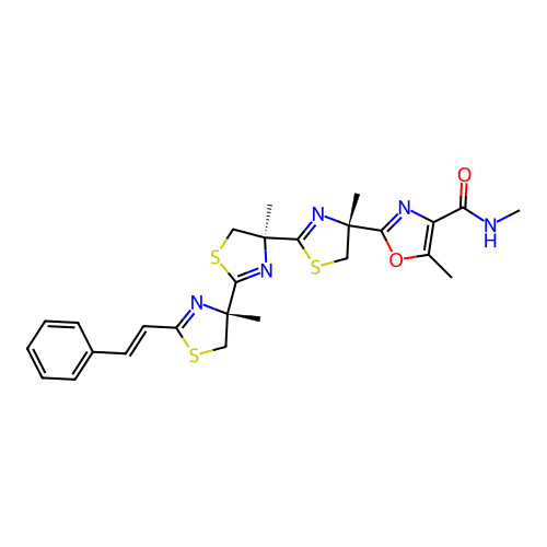 | InChI | InChI=1S/C26H29N5O2S3/c1-16-19(20(32)27-5)28-21(33-16)24(2)13-35-23(30-24)26(4)15-36-22(31-26)25(3)14-34-18(29-25)12-11-17-9-7-6-8-10-17/h6-12H,13-15H2,1-5H3,(H,27,32)/b12-11+/t24-,25-,26-/m0/s1 |