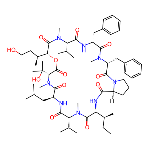 | SMILES | CC[C@H](C)[C@H]1C(=O)N([C@@H](C(=O)N[C@H](C(=O)N([C@@H](C(=O)O[C@@H](C(=O)N([C@H](C(=O)N[C@@H](C(=O)N([C@@H](C(=O)N2CCC[C@H]2C(=O)N1)CC3=CC=CC=C3)C)CC4=CC=CC=C4)C(C)C)C)[C@@H](C)CCO)C(C)(C)O)C)CC(C)C)C(C)C)C |
