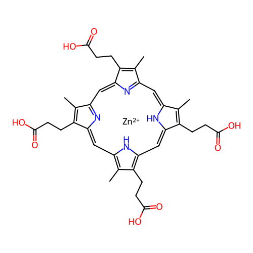 | InChI | InChI=1S/C36H38N4O8.Zn/c1-17-21(5-9-33(41)42)29-14-27-19(3)22(6-10-34(43)44)30(39-27)15-28-20(4)24(8-12-36(47)48)32(40-28)16-31-23(7-11-35(45)46)18(2)26(38-31)13-25(17)37-29;/h13-16,38,40H,5-12H2,1-4H3,(H,41,42)(H,43,44)(H,45,46)(H,47,48);/q;+2 |