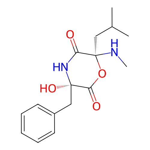 | SMILES | CC(C)C[C@]1(C(=O)N[C@@](C(=O)O1)(CC2=CC=CC=C2)O)NC |