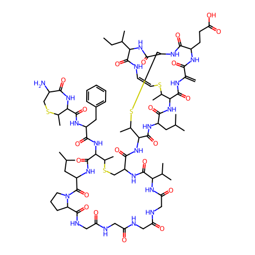 | SMILES | CCC(C)C1C(=O)N/C=C\SC(C2C(=O)NC(=C)C(=O)NC(C(=O)NC(CSC(C(C(=O)NC(C(=O)N2)CC(C)C)NC(=O)C3CSC(C(C(=O)NC(C(=O)N4CCCC4C(=O)NCC(=O)NCC(=O)NCC(=O)NCC(=O)NC(C(=O)N3)C(C)C)CC(C)C)NC(=O)C(CC5=CC=CC=C5)NC(=O)C6C(SCC(C(=O)N6)N)C)C)C)C(=O)N1)CCC(=O)O)C |