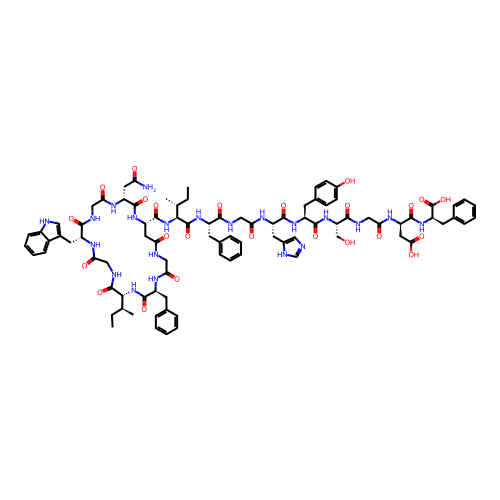 | SMILES | CC[C@H](C)[C@@H]1C(=O)NCC(=O)N[C@@H](C(=O)NCC(=O)N[C@@H](C(=O)N[C@@H](CC(=O)NCC(=O)N[C@H](C(=O)N1)CC2=CC=CC=C2)C(=O)N[C@@H]([C@H](C)CC)C(=O)N[C@@H](CC3=CC=CC=C3)C(=O)NCC(=O)N[C@@H](CC4=CN=CN4)C(=O)N[C@@H](CC5=CC=C(C=C5)O)C(=O)N[C@@H](CO)C(=O)NCC(=O)N[C@H](CC(=O)O)C(=O)N[C@H](CC6=CC=CC=C6)C(=O)O)CC(=O)N)CC7=CNC8=CC=CC=C87 |