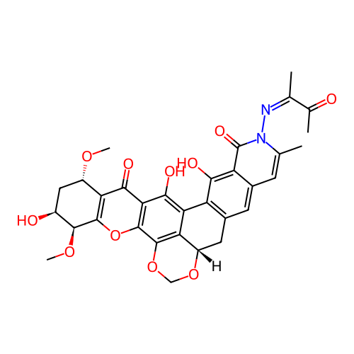 | SMILES | CC1=CC2=CC3=C(C4=C(C5=C(C6=C4[C@H](C3)OCO6)OC7=C(C5=O)[C@H](C[C@@H]([C@@H]7OC)O)OC)O)C(=C2C(=O)N1/N=C(/C)\C(=O)C)O |
