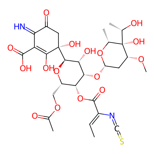 | SMILES | C/C=C(/C(=O)O[C@@H]1[C@@H](O[C@H]([C@@H]([C@@H]1O[C@H]2C[C@H]([C@@]([C@H](O2)C)([C@H](C)O)O)OC)O)[C@@]3(CC(=O)C(=N)C(=C3O)C(=O)O)O)COC(=O)C)\N=C=S |