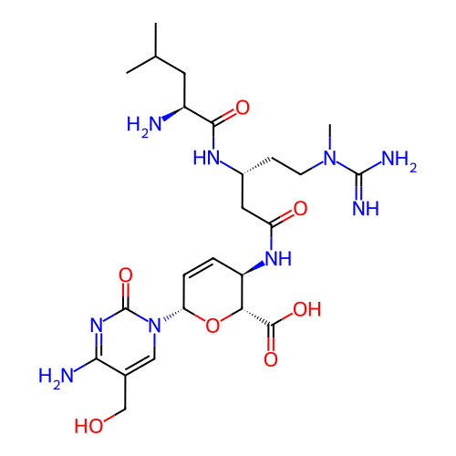 | SMILES | CC(C)C[C@@H](C(=O)N[C@H](CCN(C)C(=N)N)CC(=O)N[C@@H]1C=C[C@H](O[C@H]1C(=O)O)N2C=C(C(=NC2=O)N)CO)N |