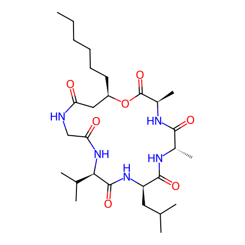 | SMILES | CCCCCC[C@@H]1CC(=O)NCC(=O)N[C@@H](C(=O)N[C@@H](C(=O)N[C@H](C(=O)N[C@@H](C(=O)O1)C)C)CC(C)C)C(C)C |