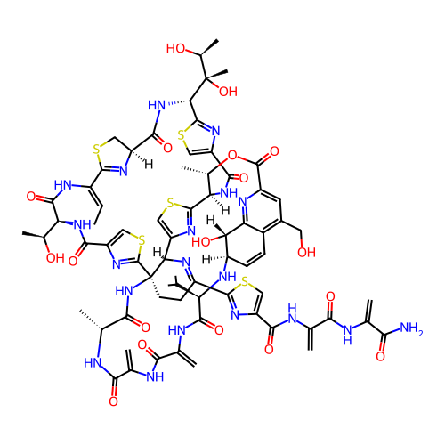 | SMILES | C/C=C\1/C2=N[C@@H](CS2)C(=O)N[C@@H](C3=NC(=CS3)C(=O)N[C@@H]4[C@@H](OC(=O)C5=NC6=C(C=C[C@H]([C@@H]6O)N[C@@H](C(=O)NC(=C)C(=O)NC(=C)C(=O)N[C@@H](C(=O)N[C@@]7(CCC(=N[C@@H]7C8=CSC4=N8)C9=NC(=CS9)C(=O)NC(=C)C(=O)NC(=C)C(=O)N)C2=NC(=CS2)C(=O)N[C@H](C(=O)N1)[C@H](C)O)C)C(C)C)C(=C5)CO)C)[C@](C)([C@H](C)O)O |
