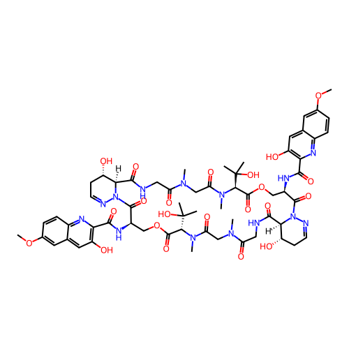 | SMILES | CC(C)([C@H]1C(=O)OC[C@H](C(=O)N2[C@@H]([C@H](CC=N2)O)C(=O)NCC(=O)N(CC(=O)N([C@H](C(=O)OC[C@H](C(=O)N3[C@@H]([C@H](CC=N3)O)C(=O)NCC(=O)N(CC(=O)N1C)C)NC(=O)C4=C(C=C5C=C(C=CC5=N4)OC)O)C(C)(C)O)C)C)NC(=O)C6=C(C=C7C=C(C=CC7=N6)OC)O)O |