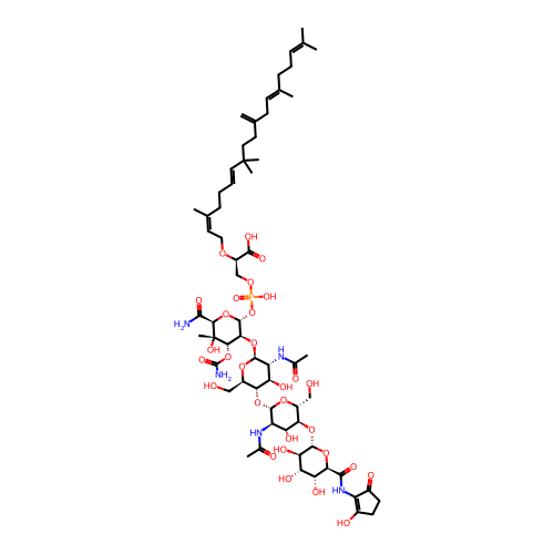 | SMILES | CC(=CCC/C(=C/CC(=C)CCC(C)(C)/C=C/CC/C(=C\CO[C@H](COP(=O)(O)O[C@@H]1[C@H]([C@@H]([C@]([C@H](O1)C(=O)N)(C)O)OC(=O)N)O[C@H]2[C@@H]([C@H]([C@@H]([C@H](O2)CO)O[C@H]3[C@@H]([C@H]([C@@H]([C@H](O3)CO)O[C@H]4[C@@H]([C@H]([C@H]([C@@H](O4)C(=O)NC5=C(CCC5=O)O)O)O)O)O)NC(=O)C)O)NC(=O)C)C(=O)O)/C)/C)C |