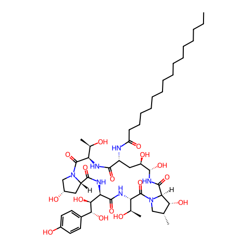 | SMILES | CCCCCCCCCCCCCCCC(=O)N[C@@H]1C[C@H]([C@@H](NC(=O)[C@H]2[C@@H]([C@@H](CN2C(=O)[C@@H](NC(=O)[C@H](NC(=O)[C@@H]3C[C@@H](CN3C(=O)[C@H](NC1=O)[C@@H](C)O)O)[C@@H]([C@@H](C4=CC=C(C=C4)O)O)O)[C@@H](C)O)C)O)O)O |