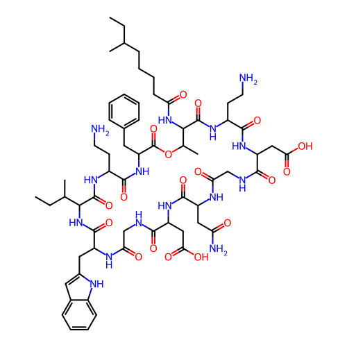 | SMILES | CCC(C)CCCCC(=O)NC1C(OC(=O)C(NC(=O)C(NC(=O)C(NC(=O)C(NC(=O)CNC(=O)C(NC(=O)C(NC(=O)CNC(=O)C(NC(=O)C(NC1=O)CCN)CC(=O)O)CC(=O)N)CC(=O)O)CC2=CC3=CC=CC=C3N2)C(C)CC)CCN)CC4=CC=CC=C4)C |