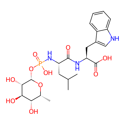 | InChI | InChI=1S/C23H34N3O10P/c1-11(2)8-16(26-37(33,34)36-23-20(29)19(28)18(27)12(3)35-23)21(30)25-17(22(31)32)9-13-10-24-15-7-5-4-6-14(13)15/h4-7,10-12,16-20,23-24,27-29H,8-9H2,1-3H3,(H,25,30)(H,31,32)(H2,26,33,34)/t12-,16+,17+,18+,19-,20+,23+/m1/s1 |
