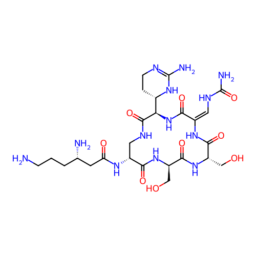 | SMILES | C1CN=C(N[C@@H]1[C@@H]2C(=O)NC[C@H](C(=O)N[C@@H](C(=O)N[C@H](C(=O)N/C(=C/NC(=O)N)/C(=O)N2)CO)CO)NC(=O)C[C@H](CCCN)N)N |