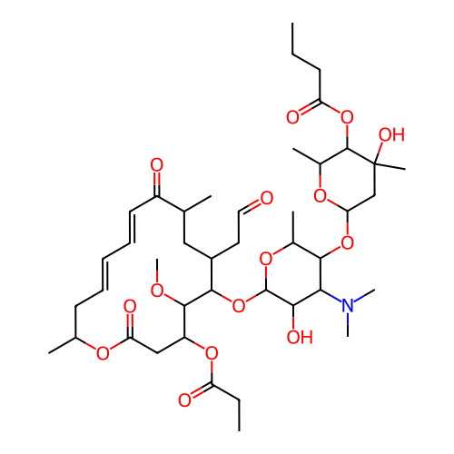 | SMILES | CCCC(=O)OC1C(OC(CC1(C)O)OC2C(OC(C(C2N(C)C)O)OC3C(CC(C(=O)/C=C/C=C/CC(OC(=O)CC(C3OC)OC(=O)CC)C)C)CC=O)C)C |