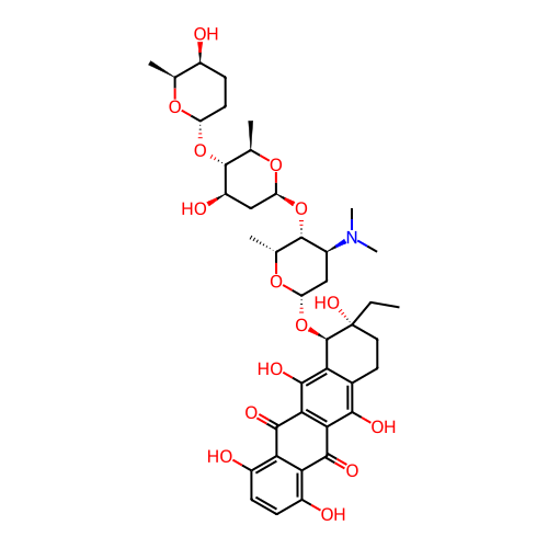 | InChI | InChI=1S/C40H53NO15/c1-7-40(50)13-12-19-28(34(47)32-31(33(19)46)35(48)29-22(43)8-9-23(44)30(29)36(32)49)39(40)56-26-14-20(41(5)6)37(17(3)52-26)55-27-15-24(45)38(18(4)53-27)54-25-11-10-21(42)16(2)51-25/h8-9,16-18,20-21,24-27,37-39,42-47,50H,7,10-15H2,1-6H3/t16-,17+,18+,20-,21-,24+,25-,26-,27-,37-,38+,39+,40+/m0/s1 |