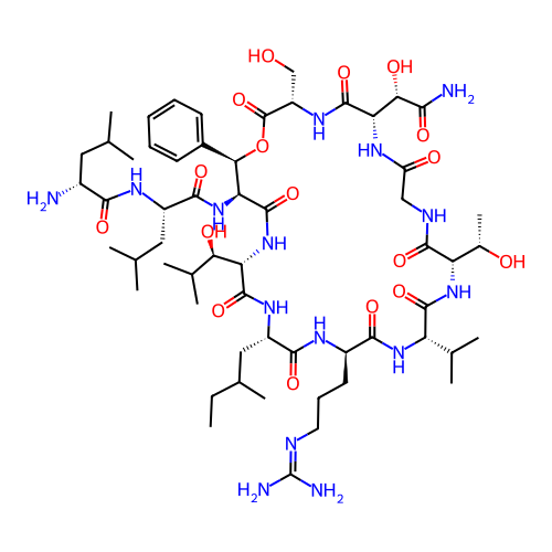 | SMILES | CCC(C)C[C@H]1C(=O)N[C@@H](C(=O)N[C@H](C(=O)N[C@H](C(=O)NCC(=O)N[C@H](C(=O)N[C@H](C(=O)O[C@@H]([C@@H](C(=O)N[C@H](C(=O)N1)[C@@H](C(C)C)O)NC(=O)[C@H](CC(C)C)NC(=O)[C@@H](CC(C)C)N)C2=CC=CC=C2)CO)[C@@H](C(=O)N)O)[C@H](C)O)C(C)C)CCCN=C(N)N |