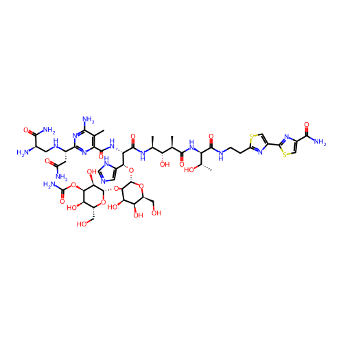| SMILES | CC1=C(N=C(N=C1N)[C@H](CC(=O)N)NC[C@H](C(=O)N)N)C(=O)N[C@@H]([C@@H](C2=CN=CN2)O[C@H]3[C@@H]([C@@H]([C@@H]([C@@H](O3)CO)O)O)O[C@H]4[C@@H]([C@@H]([C@@H]([C@H](O4)CO)O)OC(=O)N)O)C(=O)N[C@@H](C)[C@H]([C@@H](C)C(=O)N[C@H]([C@H](C)O)C(=O)NCCC5=NC(=CS5)C6=NC(=CS6)C(=O)N)O |