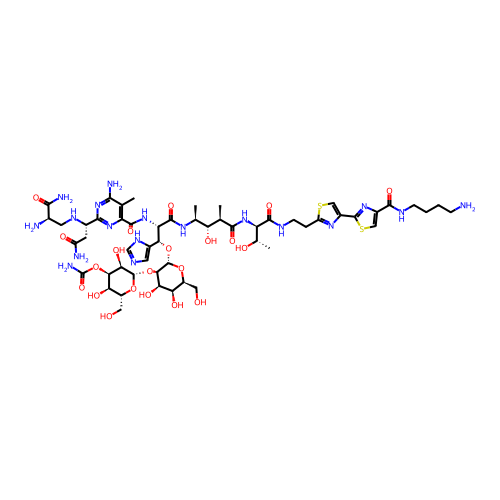 | InChI | InChI=1S/C54H82N18O21S2/c1-19-32(69-45(72-43(19)58)24(11-30(57)76)64-12-23(56)44(59)82)49(86)71-34(40(25-13-61-18-65-25)91-53-42(38(80)36(78)28(14-73)90-53)92-52-39(81)41(93-54(60)88)37(79)29(15-74)89-52)50(87)66-21(3)35(77)20(2)46(83)70-33(22(4)75)48(85)63-10-7-31-67-27(17-94-31)51-68-26(16-95-51)47(84)62-9-6-5-8-55/h13,16-18,20-24,28-29,33-42,52-53,64,73-75,77-81H,5-12,14-15,55-56H2,1-4H3,(H2,57,76)(H2,59,82)(H2,60,88)(H,61,65)(H,62,84)(H,63,85)(H,66,87)(H,70,83)(H,71,86)(H2,58,69,72)/t20-,21+,22+,23-,24+,28+,29-,33-,34+,35+,36-,37-,38-,39-,40-,41-,42-,52+,53+/m1/s1 |