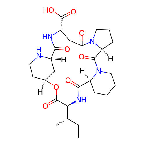 | SMILES | CC[C@H](C)[C@H]1C(=O)O[C@H]2CCN[C@@H](C2)C(=O)N[C@@H](CC(=O)N3CCC[C@H]3C(=O)N4CCCC[C@H]4C(=O)N1)C(=O)O |