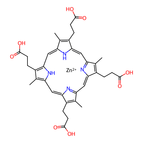 | InChI | InChI=1S/C36H38N4O8.Zn/c1-17-21(5-9-33(41)42)29-14-26-19(3)23(7-11-35(45)46)31(39-26)16-28-20(4)24(8-12-36(47)48)32(40-28)15-27-18(2)22(6-10-34(43)44)30(38-27)13-25(17)37-29;/h13-16,37-38H,5-12H2,1-4H3,(H,41,42)(H,43,44)(H,45,46)(H,47,48);/q;+2 |