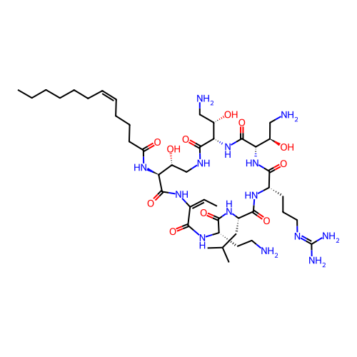 | SMILES | CCCCCC/C=C\CCCC(=O)N[C@H]1[C@@H](CNC(=O)[C@@H](NC(=O)[C@@H](NC(=O)[C@@H](NC(=O)[C@@H](NC(=O)[C@@H](NC(=O)C(=CC)NC1=O)CCN)CC(C)C)CCCN=C(N)N)[C@@H](CN)O)[C@H](CN)O)O |