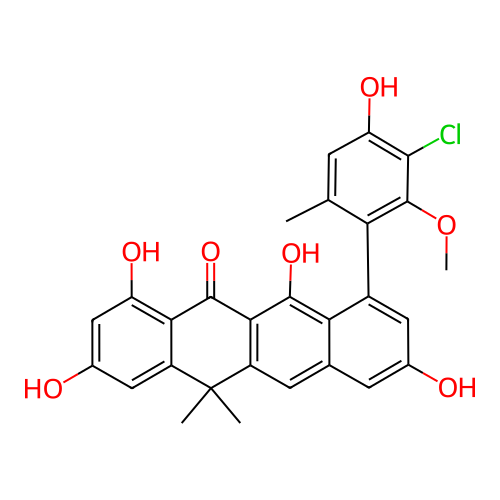 | SMILES | CC1=CC(=C(C(=C1C2=CC(=CC3=CC4=C(C(=C32)O)C(=O)C5=C(C=C(C=C5C4(C)C)O)O)O)OC)Cl)O |