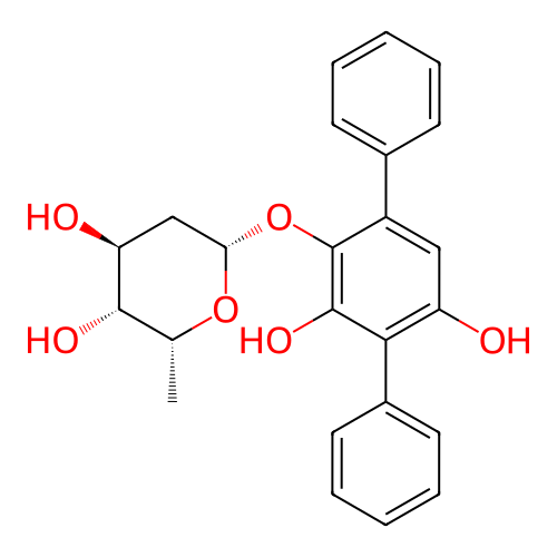 | InChI | InChI=1S/C24H24O6/c1-14-22(27)19(26)13-20(29-14)30-24-17(15-8-4-2-5-9-15)12-18(25)21(23(24)28)16-10-6-3-7-11-16/h2-12,14,19-20,22,25-28H,13H2,1H3/t14-,19+,20+,22+/m1/s1 |