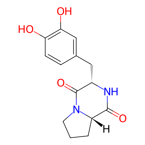 | InChI | InChI=1S/C14H16N2O4/c17-11-4-3-8(7-12(11)18)6-9-14(20)16-5-1-2-10(16)13(19)15-9/h3-4,7,9-10,17-18H,1-2,5-6H2,(H,15,19)/t9-,10-/m0/s1 |