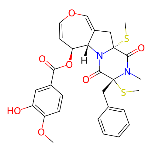 | SMILES | CN1C(=O)[C@@]2(CC3=COC=C[C@@H]([C@H]3N2C(=O)[C@@]1(CC4=CC=CC=C4)SC)OC(=O)C5=CC(=C(C=C5)OC)O)SC |