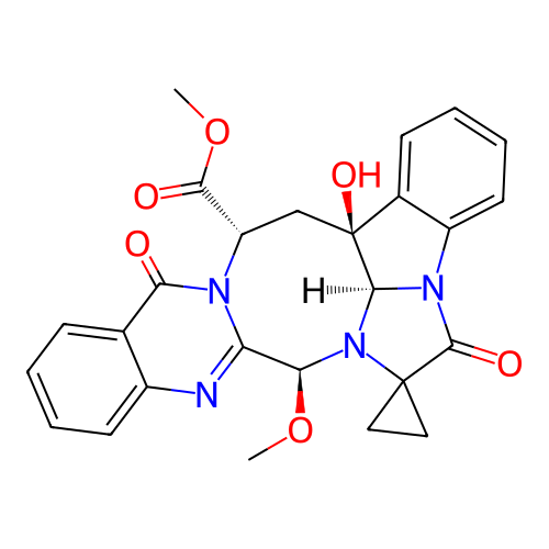 | SMILES | CO[C@H]1C2=NC3=CC=CC=C3C(=O)N2[C@@H](C[C@]4([C@@H]5N1C6(CC6)C(=O)N5C7=CC=CC=C74)O)C(=O)OC |